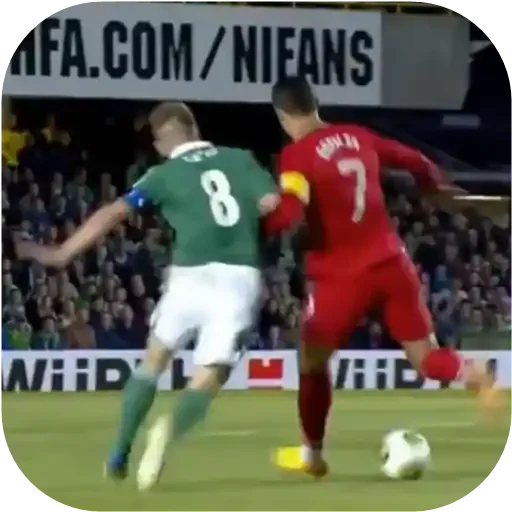 Dois jogadores de futebol, um de verde e branco e outro de vermelho, disputam a bola em um estádio lotado. O jogador de verde tem o número 8 nas costas, enquanto o de vermelho tem o número 7.