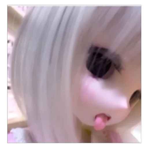 Rosto de uma garota com cabelo branco e franja, olhos castanhos e orelhas de gato rosa.