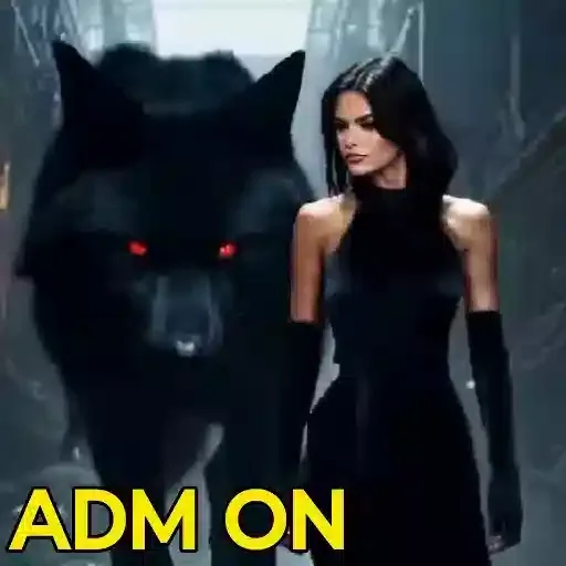 Uma mulher de cabelo preto e vestido preto ao lado de um lobo preto com olhos vermelhos, em um cenário sombrio. O texto 'ADM ON' aparece em amarelo na parte inferior.