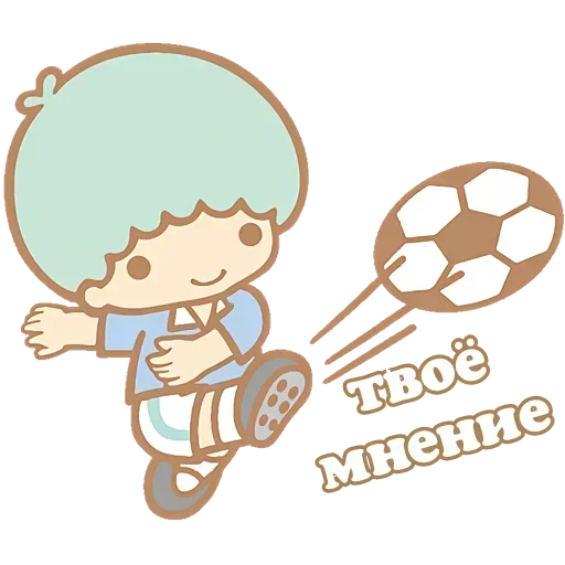 Menino de cabelo verde chuta uma bola de futebol com texto em russo 'твоё мнение' saindo da bola.
