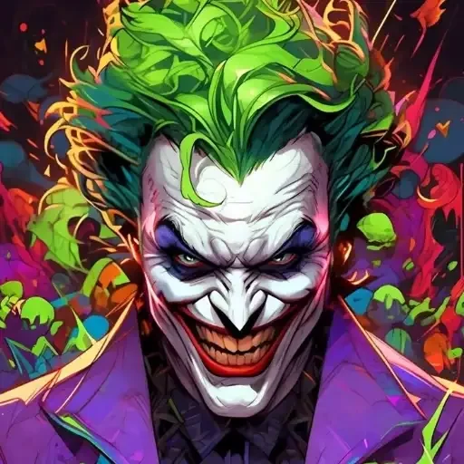 O Coringa com cabelo verde e maquiagem branca no rosto, vestindo um casaco roxo, com expressão de sorriso maníaco.