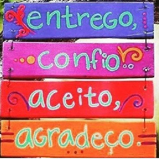 Quatro placas coloridas de madeira com texto: 'entregO, confio, aceito, agradeço.' As placas são decoradas com elementos gráficos e cores vibrantes.