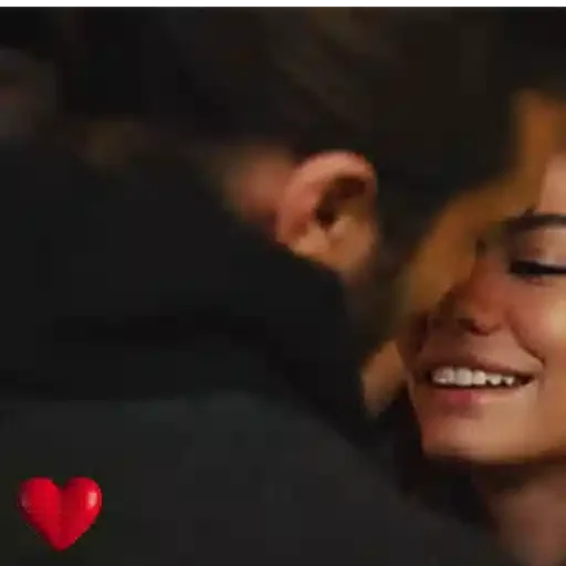 Um casal se beijando, com um coração vermelho no canto inferior esquerdo.