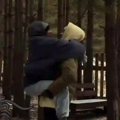 Um homem carrega outro homem nas costas em um ambiente ao ar livre com árvores e uma estrutura de madeira.