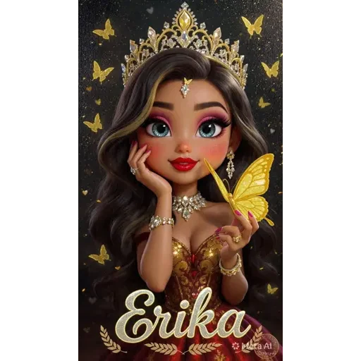 Uma mulher loira com coroa de joias e vestido dourado, segurando uma borboleta amarela, com o nome 'Erika' escrito embaixo.