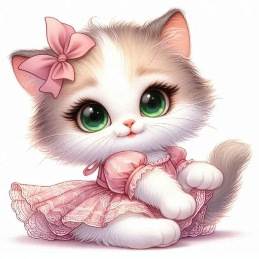 Gatinha fofa com vestido rosa e laço na orelha, olhos verdes grandes e brilhantes.