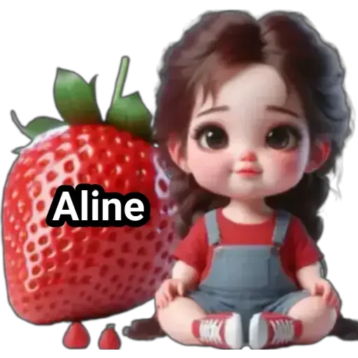 Menina de olhos grandes e cabelos castanhos sentada ao lado de uma morango gigante, com o nome 'Aline' sobreposto ao morango.