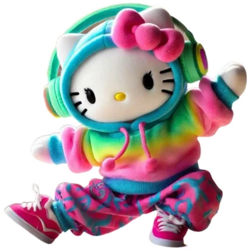 Hello Kitty vestida com um conjunto de roupas coloridas, incluindo um hoodie tie-dye rosa, azul e amarelo, calças rosa com estampas azuis, tênis rosa e um acessório rosa no cabelo. Ela parece estar dançando.