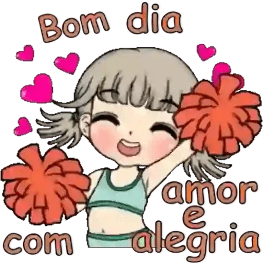 Menina de cabelo cinza com pompões vermelhos e coração, sorrindo. 'Bom dia com amor e alegria'