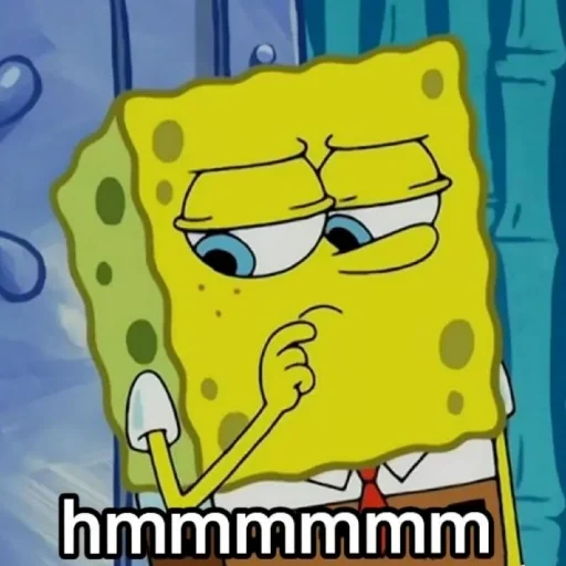 Esponja Bob com expressão pensativa, mão no queixo e olhos semicerrados, com a legenda 'hmmmmmm' na parte inferior.