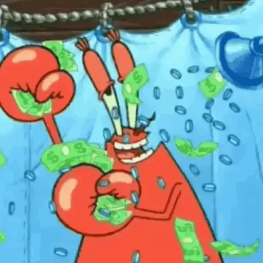 Um desenho de um personagem vermelho com dinheiro e objetos saindo de sua cabeça e corpo, em um fundo azul com água.