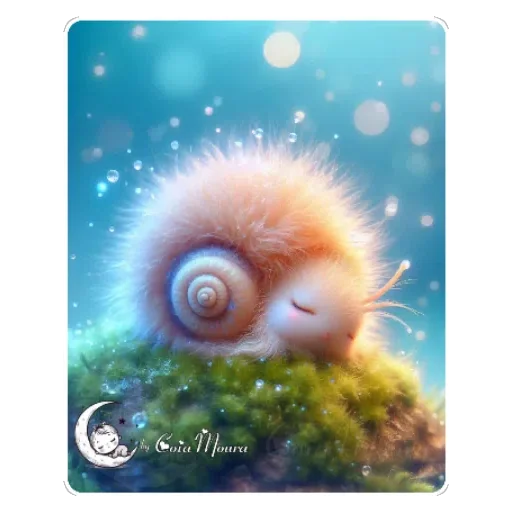 Um caracol com olhos fechados e um brilho ao redor, em uma superfície verde com fundo azul e estrelas. O caracol tem uma concha colorida e bigotes.