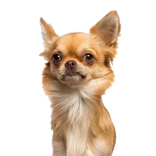 Um cachorro Chihuahua de pelo curto e liso, cor castanha clara com manchas brancas no peito, orelhas grandes e expressivas.