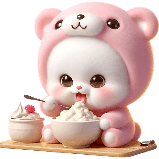 Um ursinho fofinho rosa e branco está sentado em uma tábua de madeira, comendo sorvete de uma tigela. Ele tem olhos castanhos grandes e uma expressão feliz.