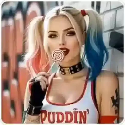Uma imagem colorida de Harley Quinn com penteados rosa e azul, maquiagem pesada e um colete vermelho. Ela está com um…