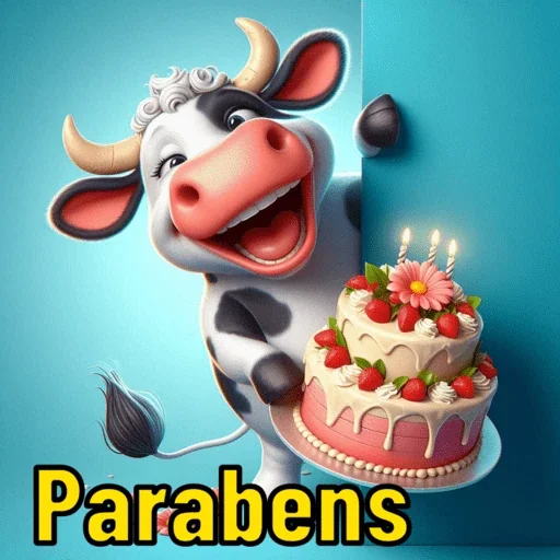 Vaca sorridente com um bolo de aniversário decorado com morangos e velas, com a palavra 'Parabens' em amarelo.