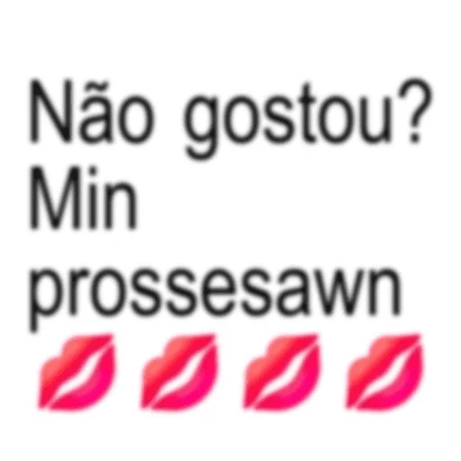 Um texto em preto que diz 'Não gostou? Min prossesawn' acompanhado de quatro beijos de lábios coloridos em vermelho.