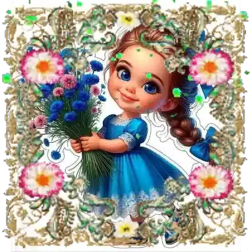 Menina de olhos azuis e cabelos castanhos em uma trança, vestindo um vestido azul, segurando um buquê de flores azuis e rosadas, rodeada por flores e folhagens.