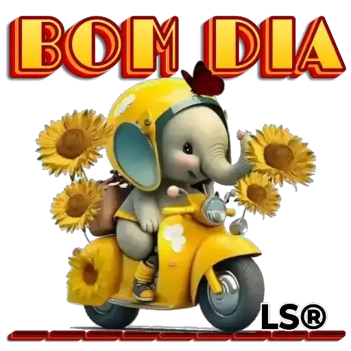 Um elefante cinza com orelhas grandes e um capacete amarelo anda de scooter amarela, segurando girassóis, com a frase 'BOM DIA' em letras grandes acima.