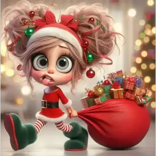 Menina fofa vestida de Natal, com touca e roupa vermelha, puxando um saco de presentes. Ela tem olhos grandes e expressão surpresa.