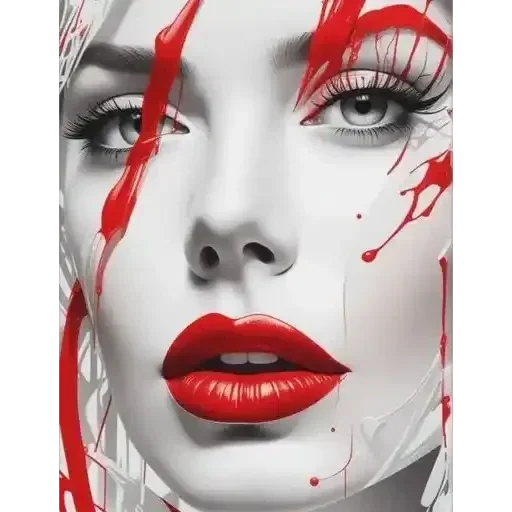 Rosto de mulher com pintura facial vermelha e lábios vermelhos, semblante sério e olhar direto.