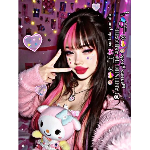 Uma jovem com cabelo preto e rosa fazendo um gesto com a mão, com um ursinho Hello Kitty rosa ao peito, em um ambiente decorado com corações e luzes.