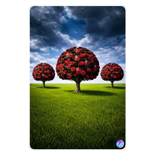 Três árvores com flores vermelhas em um campo verde sob um céu nublado. As árvores têm copas arredondadas cheias de flores.