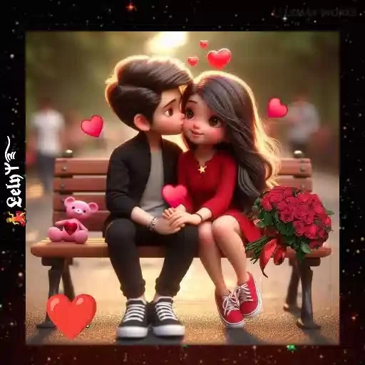 Um casal de anime sentados em um banco, com o homem beijando a bochecha da mulher. Ela está vestida de vermelho e segurando um buquê de rosas vermelhas, enquanto ele veste um casaco preto. Há corações vermelhos ao redor e um ursinho de pelúcia rosa ao lado.