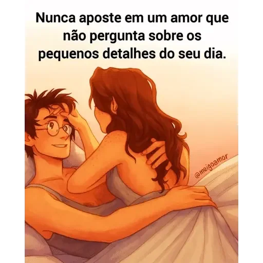 Um casal abraçado com o homem deitado e a mulher sentada ao lado, com texto em português que diz 'Nunca aposte em um amor que não pergunta sobre os pequenos detalhes do seu dia.'