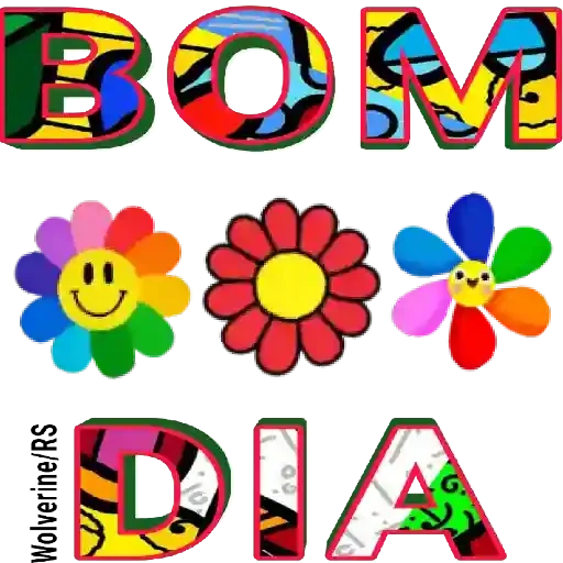 Um sticker colorido com a frase 'BOM DIA' em letras grandes e decoradas, acompanhada de três flores, sendo uma com um sorriso.