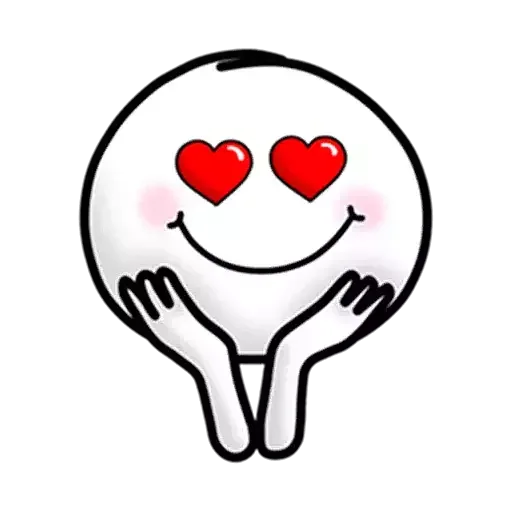 Um rosto sorridente com olhos em forma de coração e bochechas rosadas, com as mãos ao lado da cabeça.
