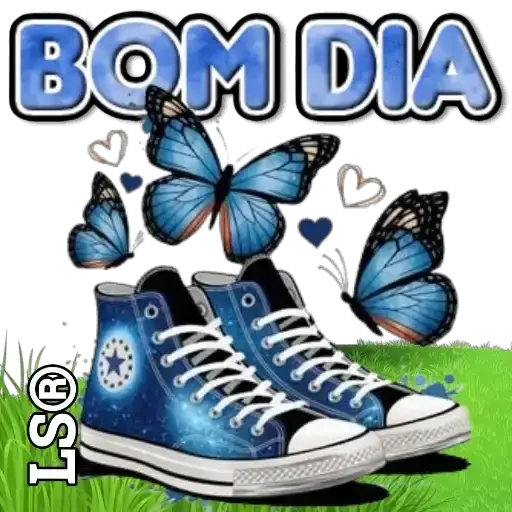 Um par de tênis Converse azul com borboletas azuis e a frase 'BOM DIA' em letras grandes. O tênis está em um gramado verde com corações e borboletas ao redor.