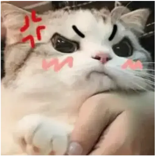 Gato branco com expressão zangada, desenhada com sobrancelhas grossas e bochechas rosadas. A imagem traz um rabisco vermelho no canto superior esquerdo.