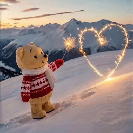Um ursinho de pelúcia vestindo um suéter vermelho e branco segura um sparkler fazendo um coração com luzes em uma paisagem de neve ao pôr do sol.