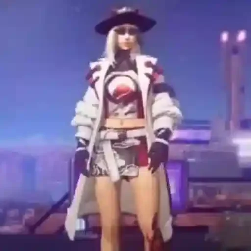 Uma mulher com cabelo loiro e chapéu preto, vestindo uma jaqueta branca com detalhes em preto e vermelho, shorts e um cropped com um desenho vermelho no peito.