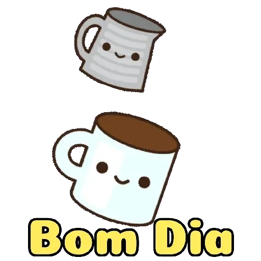 Dois copos com expressões faciais sorridentes e a frase 'Bom Dia' embaixo, em um estilo cartoon.