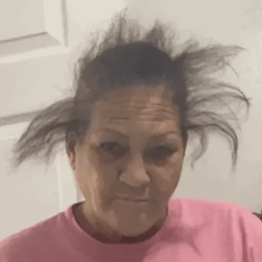 Uma mulher mais velha com o cabelo desarrumado e uma expressão facial neutra, usando uma blusa rosa. Ela está em frente a uma porta branca.