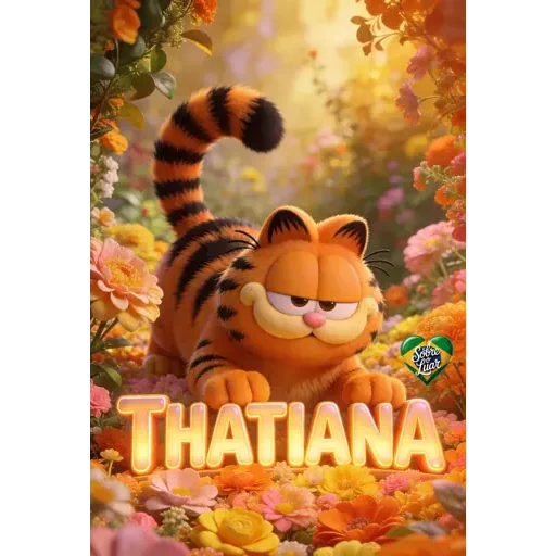 Gato laranja com listras pretas em um jardim de flores coloridas, com o texto 'THATIANA' em letras grandes e douradas.