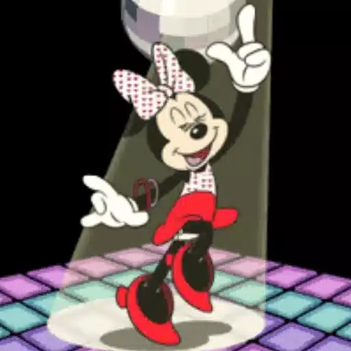Mickey Mouse vestido de Minnie, com um grande laço na cabeça, dançando em uma pista de dança colorida com um fundo preto.