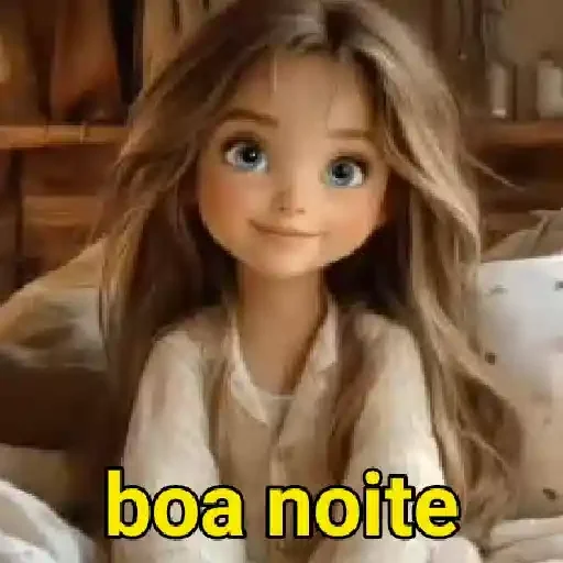 Menina de olhos azuis e cabelos castanhos claros com expressão neutra e a frase 'boa noite' em amarelo.