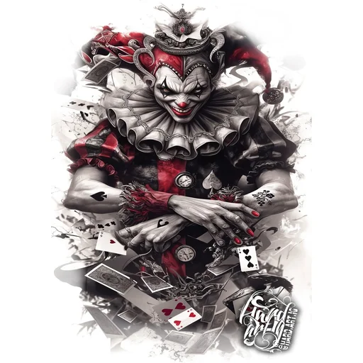 Um coringa de cartas de baralho com maquiagem de palhaço, vestindo um traje vermelho e preto, com cartas de baralho ao redor.