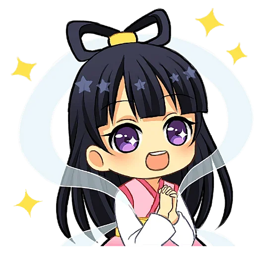 Garotinha fofa de anime com cabelo preto e laço, roupa rosa e branca, olhos roxos grandes e brilhantes, com estrelas douradas ao redor.