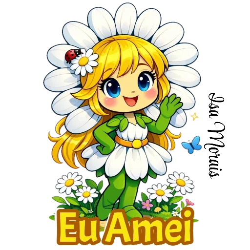 Uma menina de cabelos loiros com uma flor na cabeça e uma joaninha, vestida de verde e branco, com a frase 'Eu Ameei' embaixo.