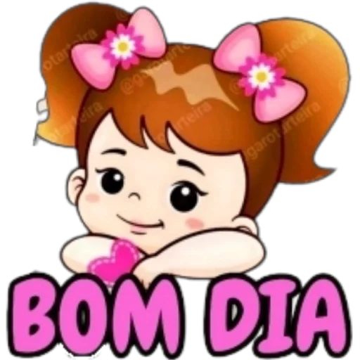 Menina de cabelos castanhos com dois coque com laços cor-de-rosa, sorrindo e com as mãos apoiadas em uma superfície. Abaixo dela, está escrito 'BOM DIA' em letras grandes e cor-de-rosa.