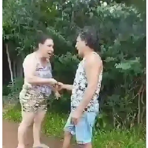 Um homem e uma mulher em um ambiente externo, ele vestindo uma camisa vermelha e preta, ela sentada em uma cadeira…