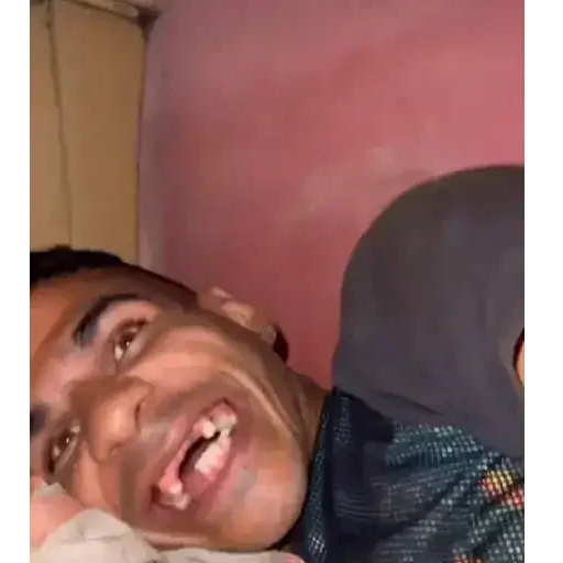 Rosto de um jovem homem com expressão de surpresa ou choque, com a boca aberta e olhos arregalados, contra um fundo rosa.