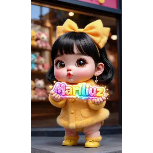 Menina de anime com cabelo preto e um laço amarelo na cabeça, vestindo um casaco e sapatos amarelos, segura um sinal com o texto 'Marilu'z em cores arco-íris.