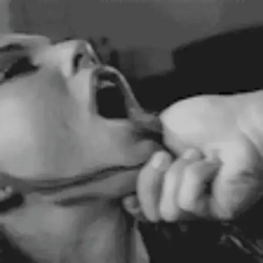 Rosto de uma pessoa com a boca aberta e expressão de dor ou choque, com uma mão próxima ao seu rosto.