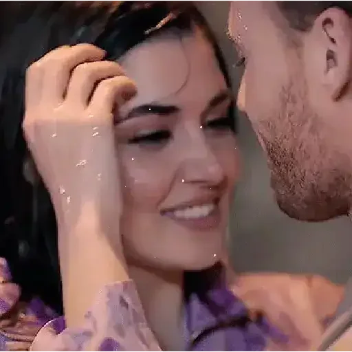 Mulher com expressão sensual e mão no cabelo enquanto um homem se aproxima. Ela parece molhada, com gotas de água visíveis.