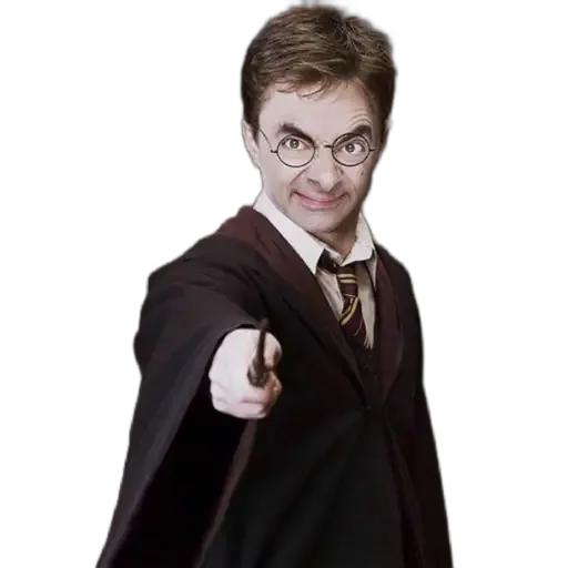 Harry Potter aponta uma varinha mágica enquanto veste uma capa preta, terno e óculos redondos.